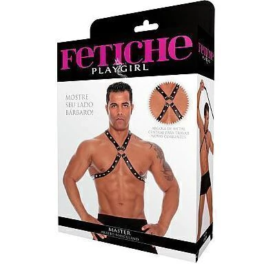 Desperte o guerreiro que há em você com o arreio para tórax em courvin, inspirado na força dos grandes bárbaros e na intensidade da dominação. Seu design robusto, com argola de metal central, permite travar correntes para jogos de submissão e prazer, elevando a experiência a um novo patamar.
